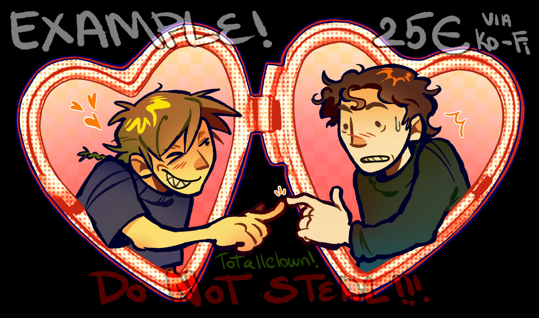 !! to request a commission slot or to ask anything work related, DM me on instagram/discord. @totallclown on all platforms!!! after DMing me for a slot, I will send you a google forms link and you will complete it with all the info that you have about your comm.PLEASE TAKE YOUR TIME TO READ EVERTYHING ON THIS PAGE BEFORE ASKING FOR A COMMISSION!